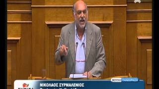 Τοποθετούμενος αναφορικά με το νομοσχέδιο για τον Τουρισμό, ο Νίκος Συρμαλένιος επεσήμανε ότι τα στοιχεία της Τράπεζας της Ελλάδος για το Μάιο 2014 καταγράφουν αύξηση αφίξεων 12,6% σε σχέση με το Μάιο 2013, όμως οι εισπράξεις αυξάνονται οριακά μόνο κατά 0,8%, και τόνισε ότι το τουριστικό μοντέλο που υιοθετεί η κυβέρνηση, έχει τρεις στόχους: